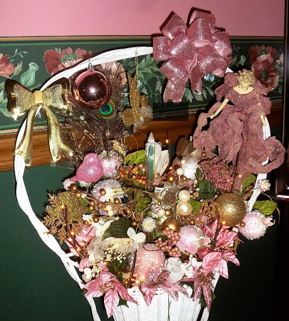 Sconces on each side of the large picture titled " May I Play?" have pink and white poinsettia candle rings and angel wings added to them.....